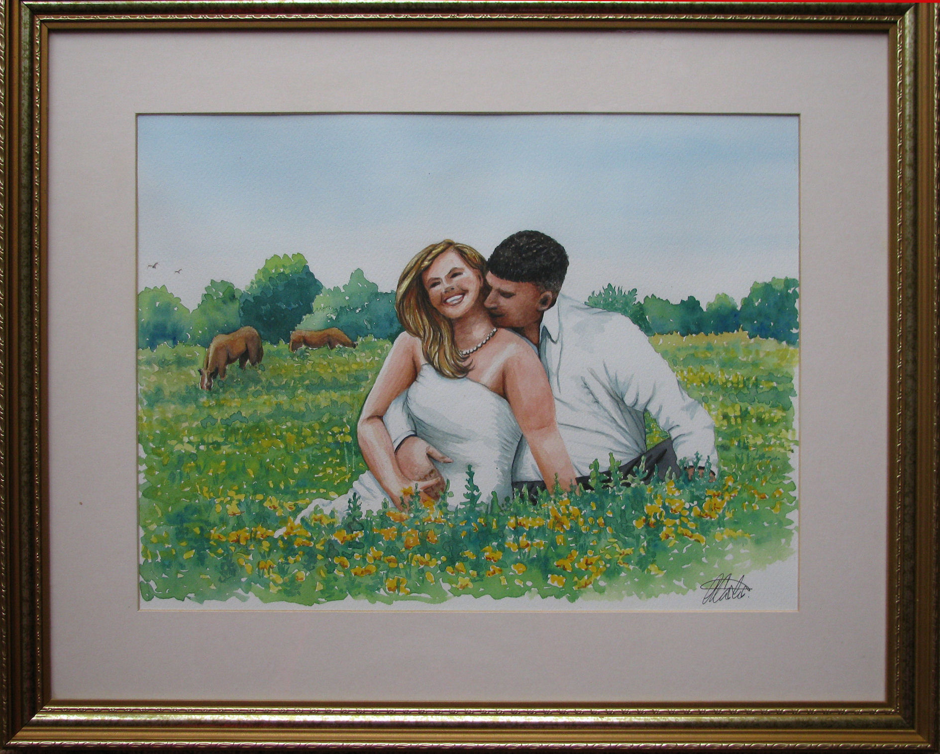 Description: This was a commission to celebrate a wedding. The composition was drawn from several photos celebrating their engagement . I like the expression on her face. She is so in love.