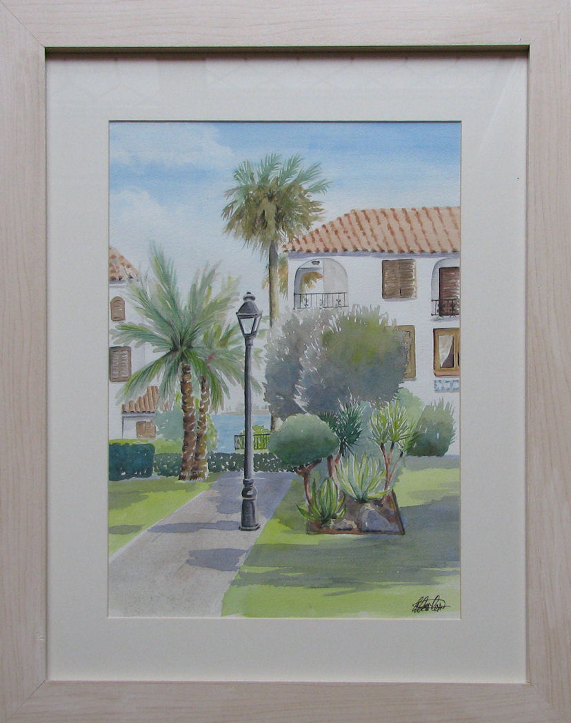 Description: Spanish Villa2(pic 11x16ins,frame19x23ins) painted this on holiday after playing tennis and swimming. The gardens at this resort near La Manga were delightful.