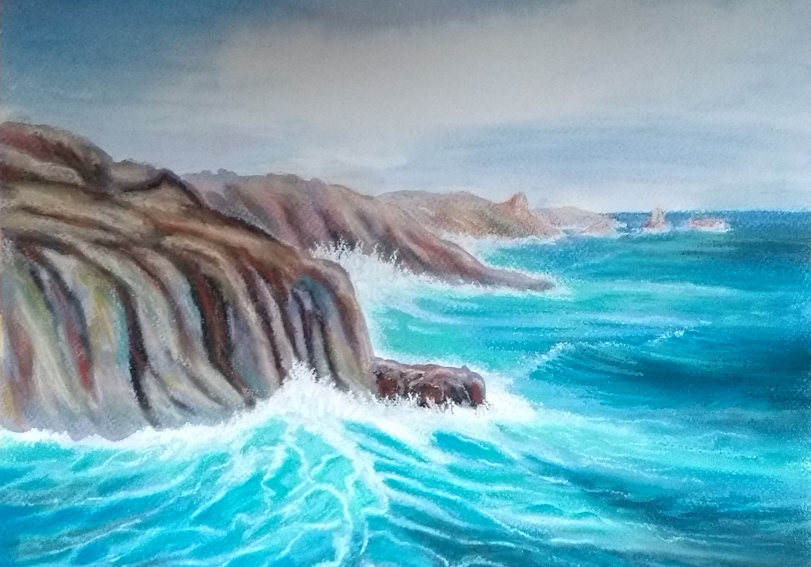 Description: An impressionist rendition of rocks and sea swell